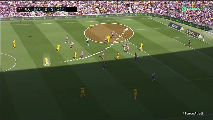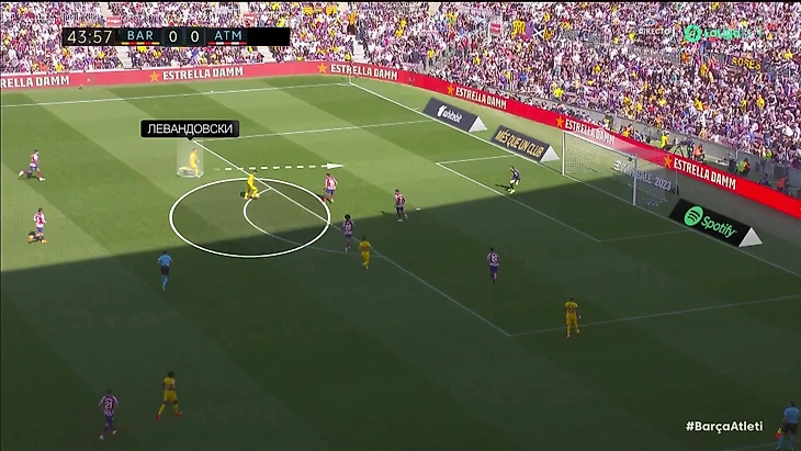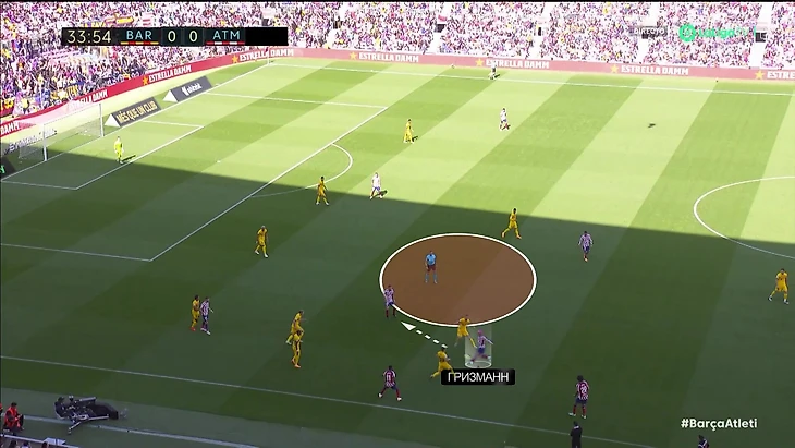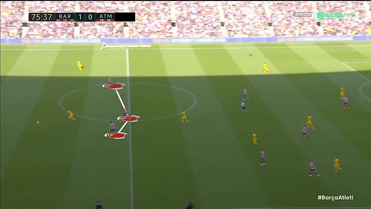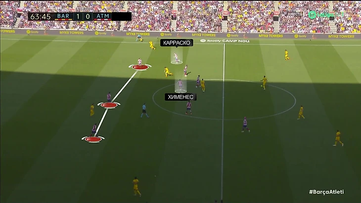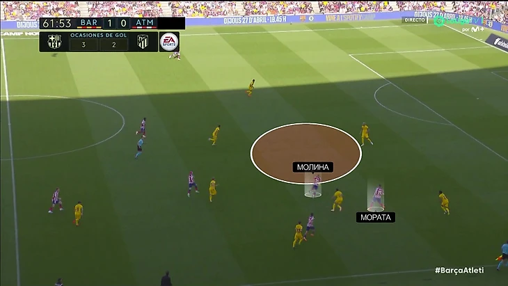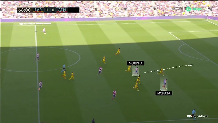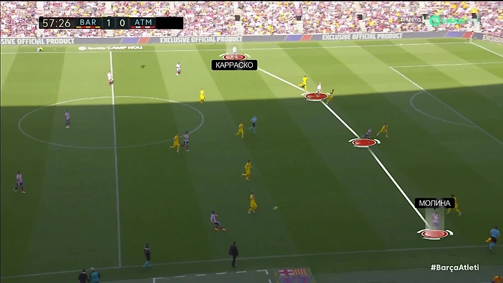 «Барсе» была особенно неудобна такая траектория, хотя и классические подключения тоже было контролировать трудно (из-за того, что «Атлетико» старался нагрузить оборону четверкой, а у «Барсы» никто дополнительно не садился). Движение на правом фланге давало «Атлетико» регулярный выход в атаку.