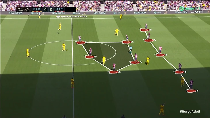В рамках этой формации команда делится на две пятерки – оборонительную, которая держит линию, и атакующую, которая тоже двигается как единый механизм, смещаясь по мячу и закрывая центр. Эти смещения блестяще отлажены у «Атлетико».