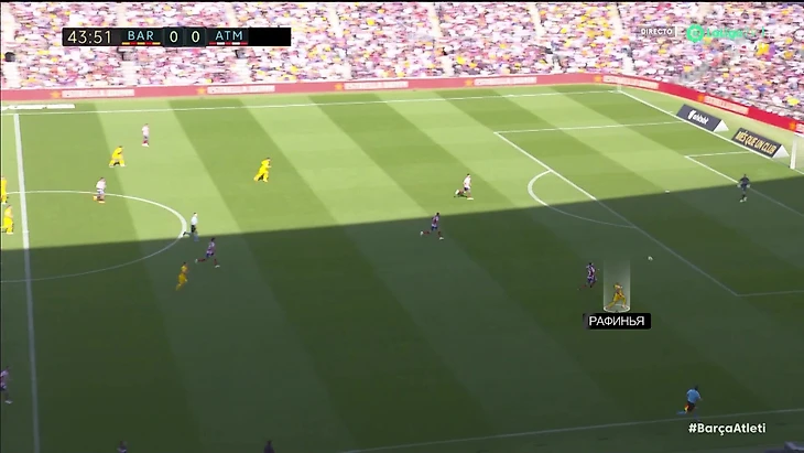 Все изменил гол из нетипичной атаки «Барсы». Команда зацепилась за редкую в рисунке тайма возможность атаковать на пространстве. После возврата мяча последовала быстрая доставка Рафинье, который выиграл борьбу и отдал пас в центр: