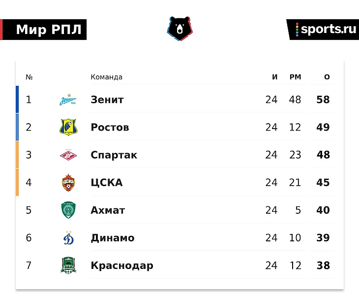 У «Ростова», «Спартака» и ЦСКА есть ощутимый отрыв от остальных. Вот как выглядит таблица.