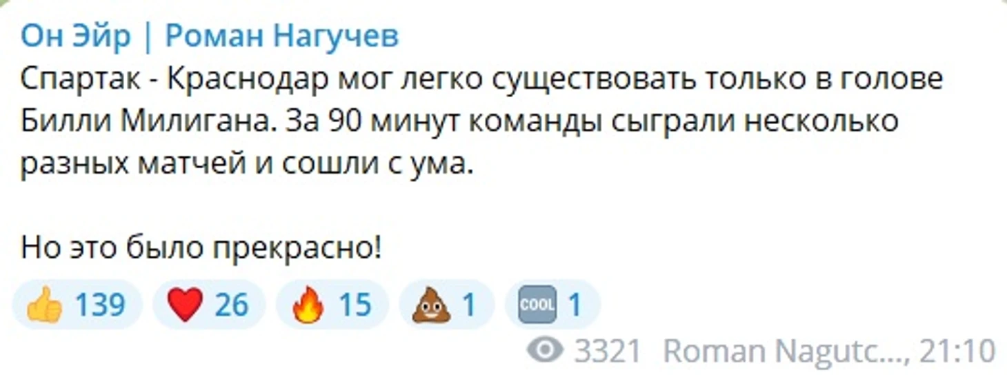Комментатор «Матч ТВ» Роман Нагучев отреагировал на эпичный матч «Спартака» и «Краснодара», в котором москвичи проигрывали 0:2, но в итоге победили 4:3.