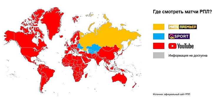 Где была доступна такая опция? Ниже карта мира с бродкастерами РПЛ, информация взята с официального сайта лиги (актуальна на 08/05/2023).