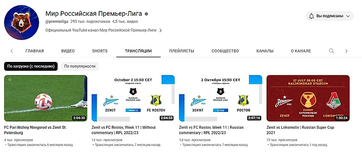 В последние годы, после постепенного отказа европейских и большинства других мировых вещателей от покупи прав на показ матчей РПЛ, лига организовала дистрибуцию видеоконтента напрямую через YouTube.