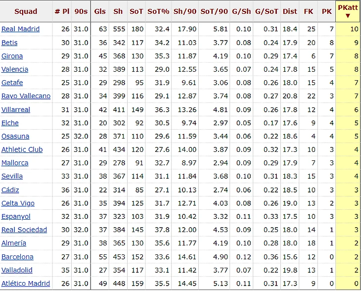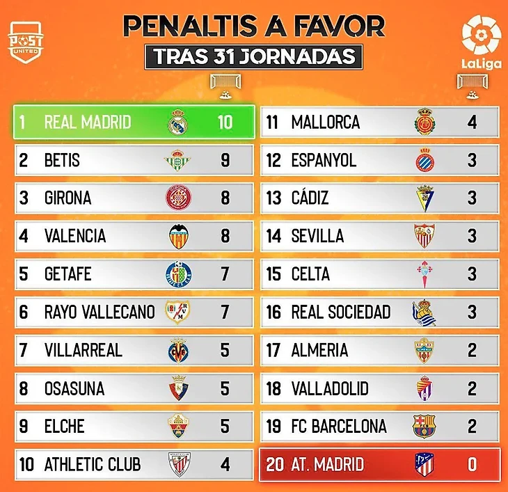Испанский ресурс Post United опубликовал статистику пробитых пенальти по состоянию на 31 тур Ла Лиги. Лидером по этому показателю стал «Мадрид», который пробил 12 пенальти.