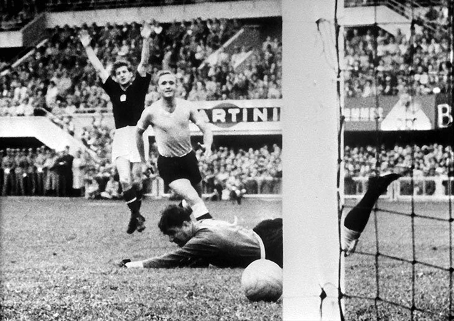 Поле в Лозанне, на котором всего четыре дня назад изнывали от страшной жары австрийцы и швейцарцы, теперь было мокрым от несильного, но продолжительного дождя. Несмотря на погодные условия, скользкий газон и потяжелевший мяч, команды с первых секунд на радость болельщикам включили режим максимальной техничности и скорости. Индивидуальному мастерству уругвайцев противостояли короткие и точные передачи венгров, показывавших выверенную командную игру. Постепенно мадьяры буквально осадили штрафную соперников, но удар Хидегкути с острого угла пришелся чуть выше ворот, а Кочиш попал прямо во вратаря Масполи. Наконец, на 12-й минуте встречи количество перешло в качество: Хидегкути навесил в район границы штрафной уругвайцев, Кочиш в касание переправил мяч головой вперед, а Цибор ускользнул от опеки и покатил мяч в дальний от Масполи угол. Уругвайцы едва было не ответили через пару минут, но Скьяффино, вылетая на рандеву с Грошичем, совсем чуть-чуть не дотянулся до мяча. Быстрый гол завел обе команды, и они задвигались еще быстрее, атакуя и обороняясь практически без передышки. Мяч курсировал между обеими штрафными площадками с космической скоростью. На двадцатой минуте встречи сильнейший удар Кочиша отправил в нокаут одного из фотографов, расположившихся за воротами уругвайского голкипера, а Лантош, пробивая штрафной с двадцати метров, попал в стенку. На своей стороне поля Грошич потащил два великолепных удара в исполнении Борхеса и Хохберга и двумя своевременными выходами прервал опасные атаки соперников. Вратарь сборной Венгрии вообще проводил отличный первый тайм, и во многом лишь благодаря ему уругвайцы не сумели сравнять счет. Масполи тоже пришлось поработать: венгры заработали немало угловых, завершившихся борьбой в штрафной с участием голкипера, а удар Кочиша головой с близкого расстояния заставил вратаря сделать один из шикарнейших сейвов всего турнира. Предсказать, кто выйдет победителем из этой быстрой, идущей на встречных курсах, красивой игры было крайне сложно.