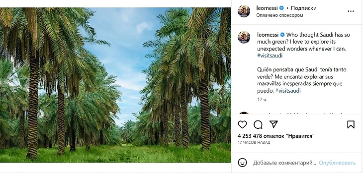 Месси выложил фото с пальмами и подписал его: «Кто думал, что в Саудовской Аравии так много зелени? Я люблю исследовать ее неожиданные чудеса всякий раз, когда могу #visitsaudi».