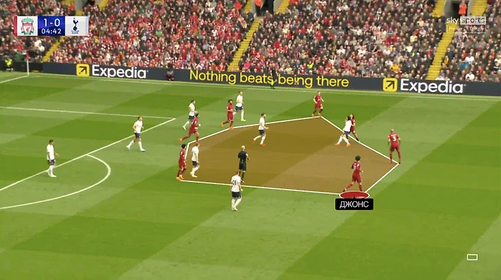 Против «Тоттенхэма» контрпрессинг тоже помог: перед вторым голом «Ливерпуль» здорово отреагировал на потерю. В зоне мяча сразу семь игроков, в том числе Джонс, который сместился с левого фланга и добавил компактности: