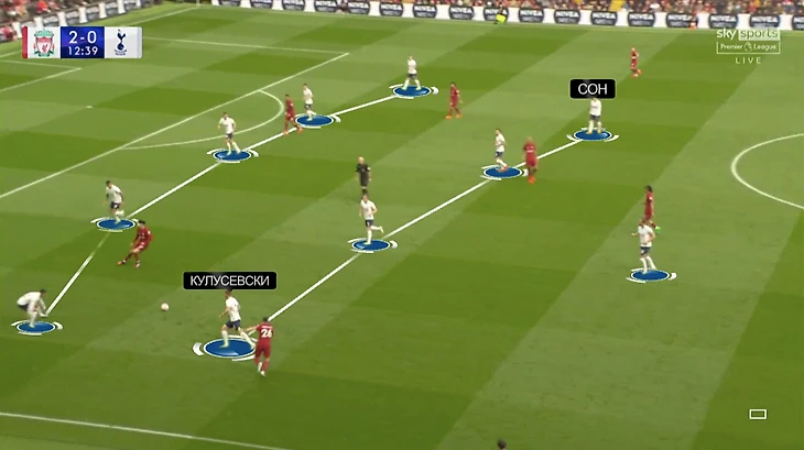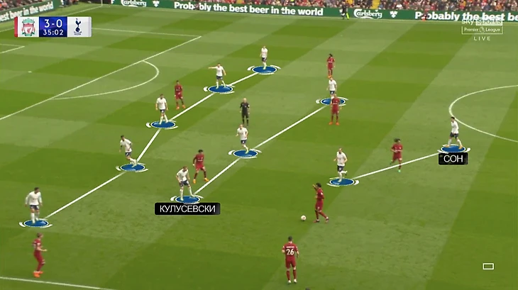 В середине первого тайма Мэйсон поменял схему. Кулусевски опустился к опорникам, а Сон поднялся к Харри Кейну. Построили 5-3-2: