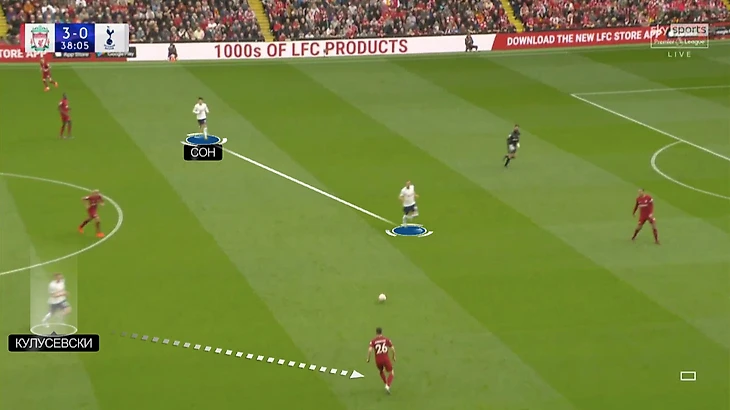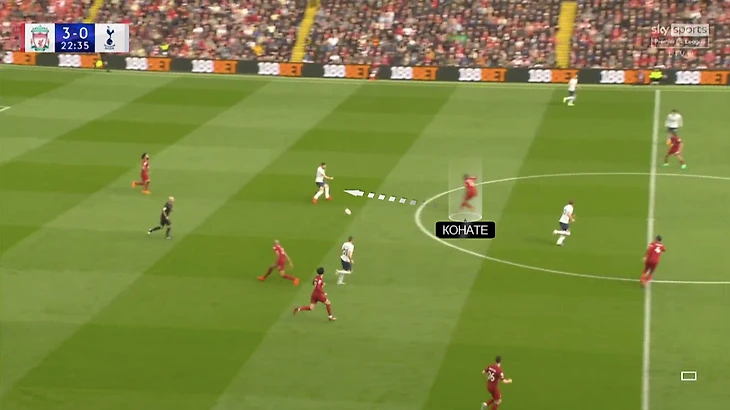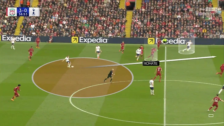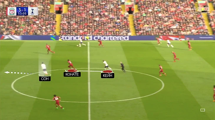Вот эпизод перед первым голом «шпор» – Конате выдернулся на Сона, а Оливер Скипп пользуется и закидывает в зону, которую оставил защитник: