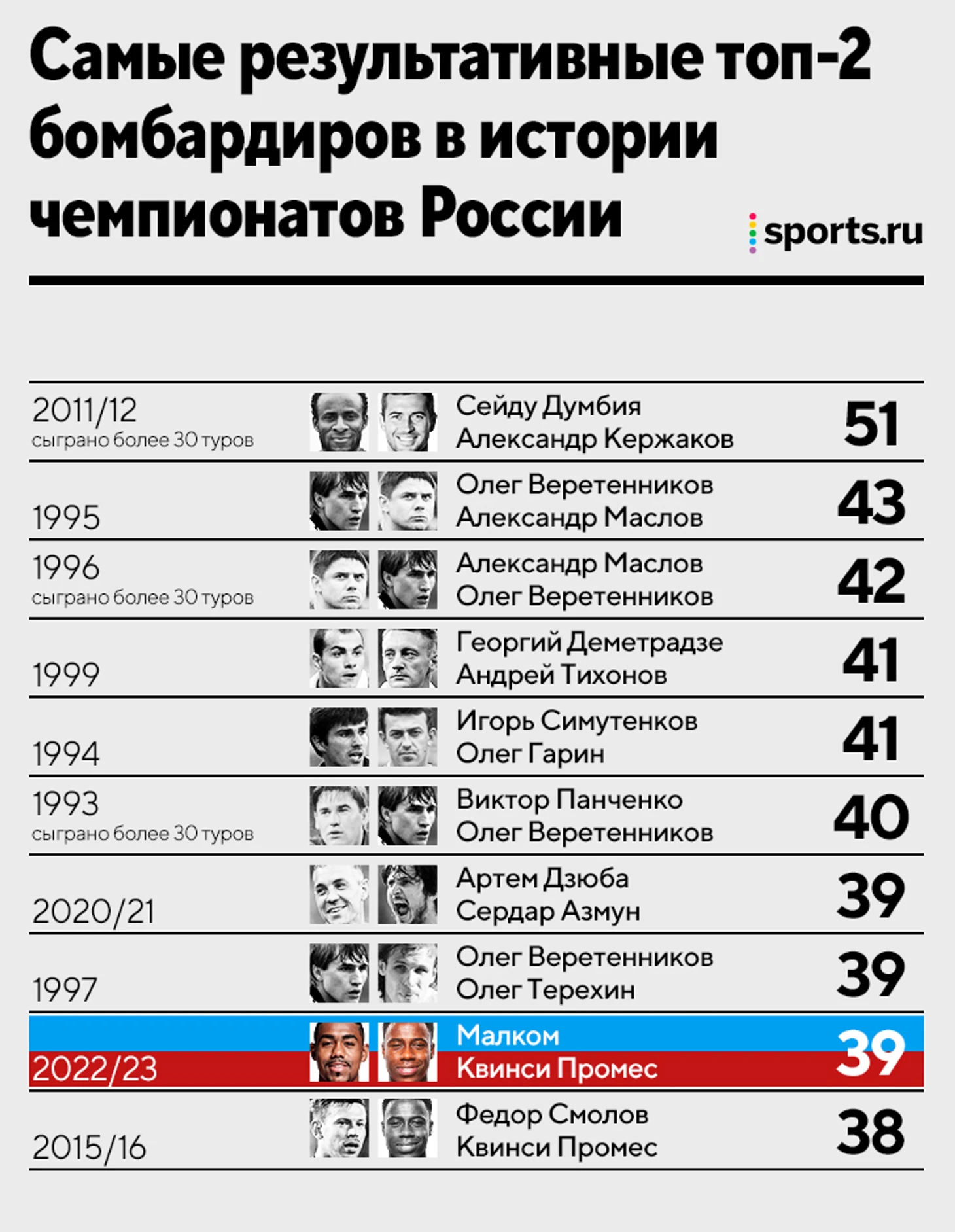 Малком и Промес уже настреляли 39 голов на двоих. Эта бомбардирская гонка уникальна для нашей лиги. Скорее всего, рекорд переходного чемпионата выстоит (все же тогда сыграли 44 тура), но до повторения результата Олега Веретенникова и Александра Маслова осталось всего 4 мяча.