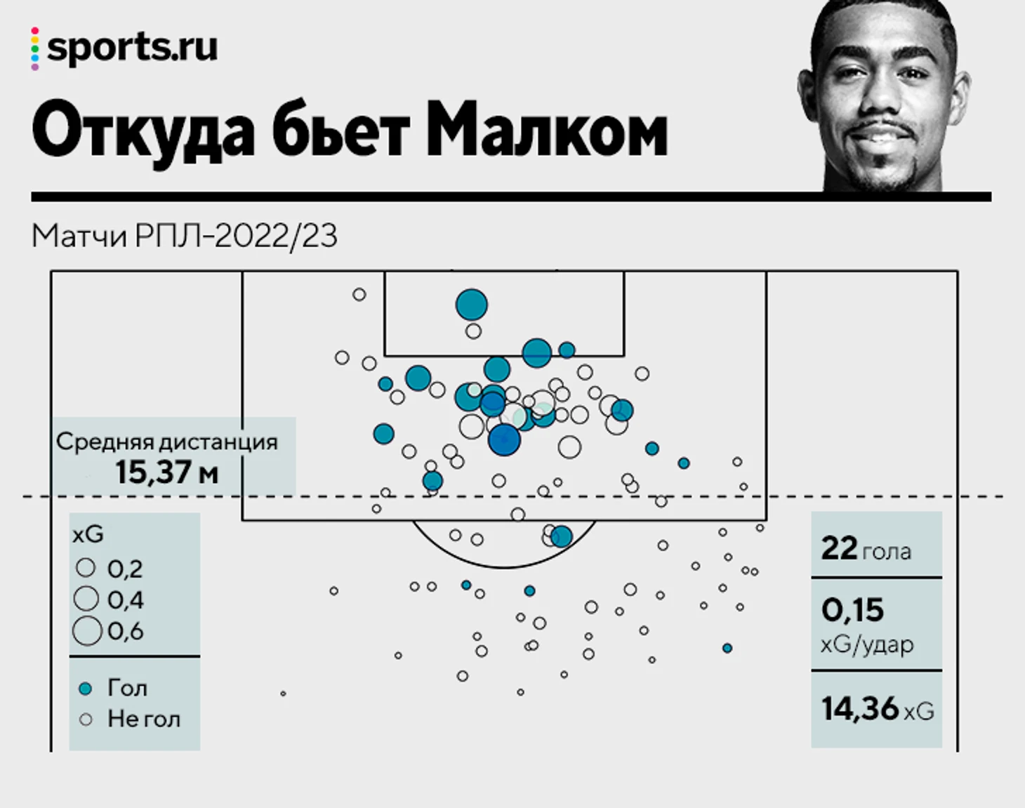 Малком – самый бьющий игрок РПЛ в этом сезоне. Бразилец лидирует по общему xG и без учета пенальти. В прошлых чемпионатах манера Малкома отличалась: долго адаптировался, плохо реализовывал моменты, был вспомогательным звеном для нападающих и контроля (из-за этого реже бил), а сейчас стал главной звездой впереди.