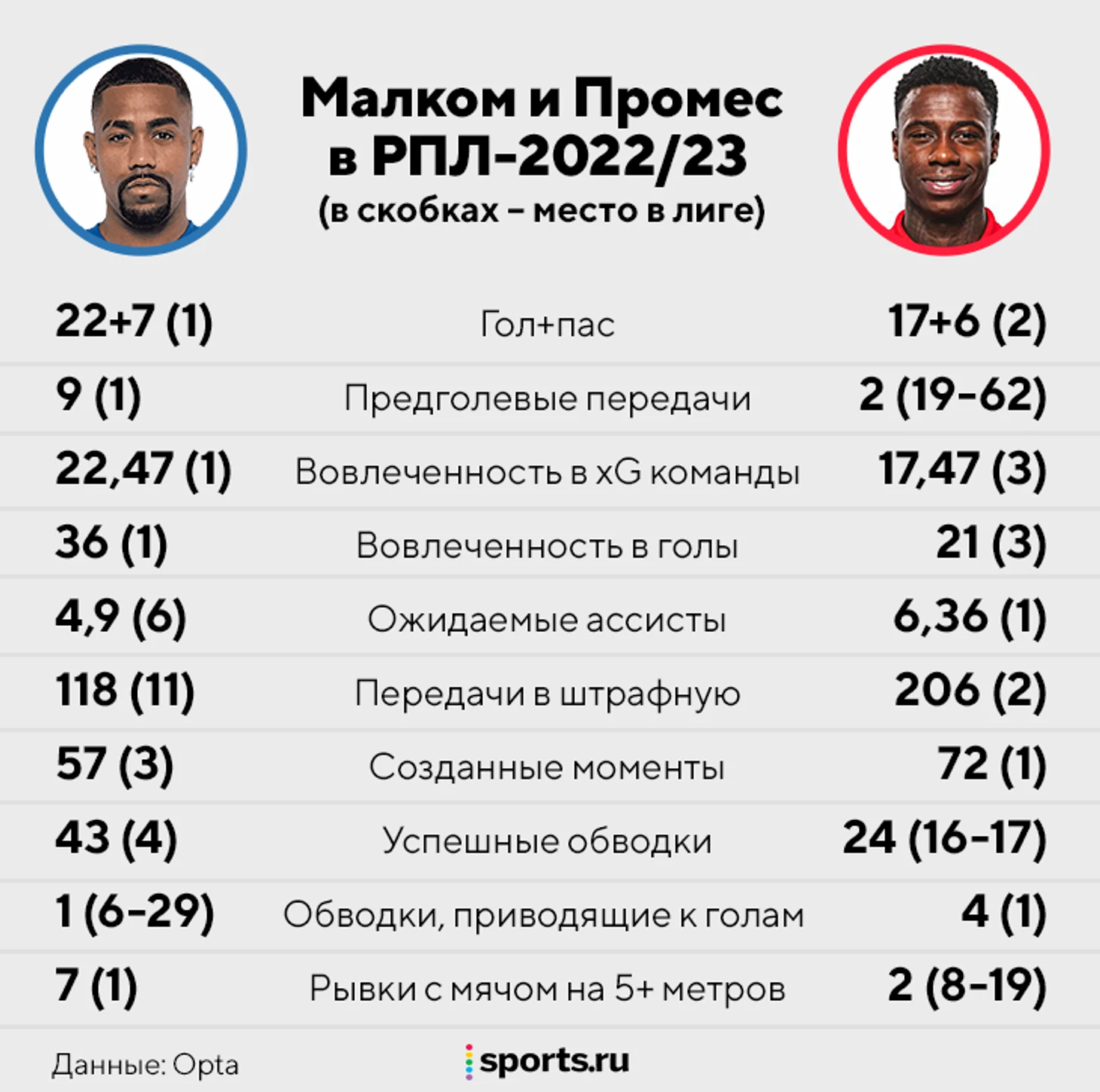 Малком и Квинси Промес – лучшие атакующие игроки РПЛ-2022/23. Вингеры проводят самые результативные сезоны в карьере: Малком набрал 22+7 и гонится за Олегом Веретенниковым (25 голов в 1995-м), а Квинси Промес перебил личный рекорд чемпионата-2015/16 (17+6 – сейчас, 18+4 – тогда).