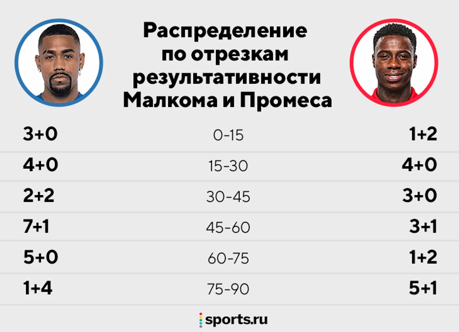 Оба доминируют во вторых таймах. Малком просыпается после перерыва и добивает соперников ассистами в концовках. Пик активности Промеса – последние 15 минут, но 6 из 7 победных голов он забил раньше.