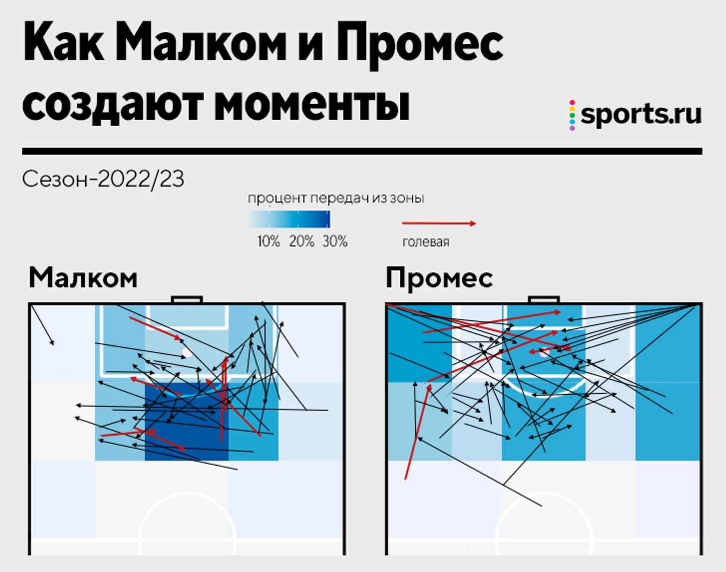 На карте ниже показано, как Малком и Промес создают голевые моменты. Серые линии – передачи из разных зон, красные – ассисты. Чем темнее зона, тем больше пасов из этой позиции.