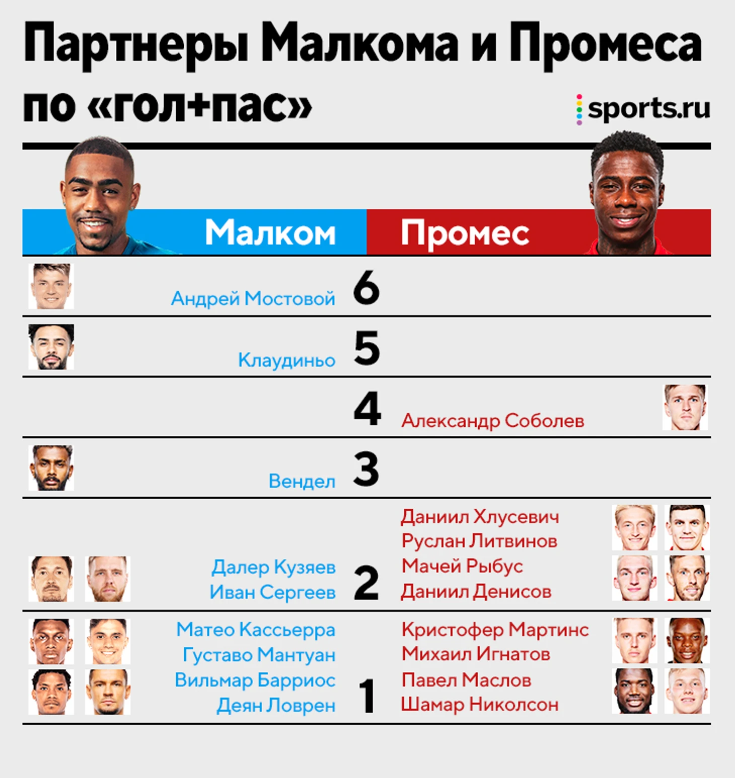 Малком и Промес – участники трех из пяти самых результативных связок сезона. Особенно интересен сюжет с участием Малкома и Андрея Мостового – вингеры с противоположных флангов придумали уже 6 голов.