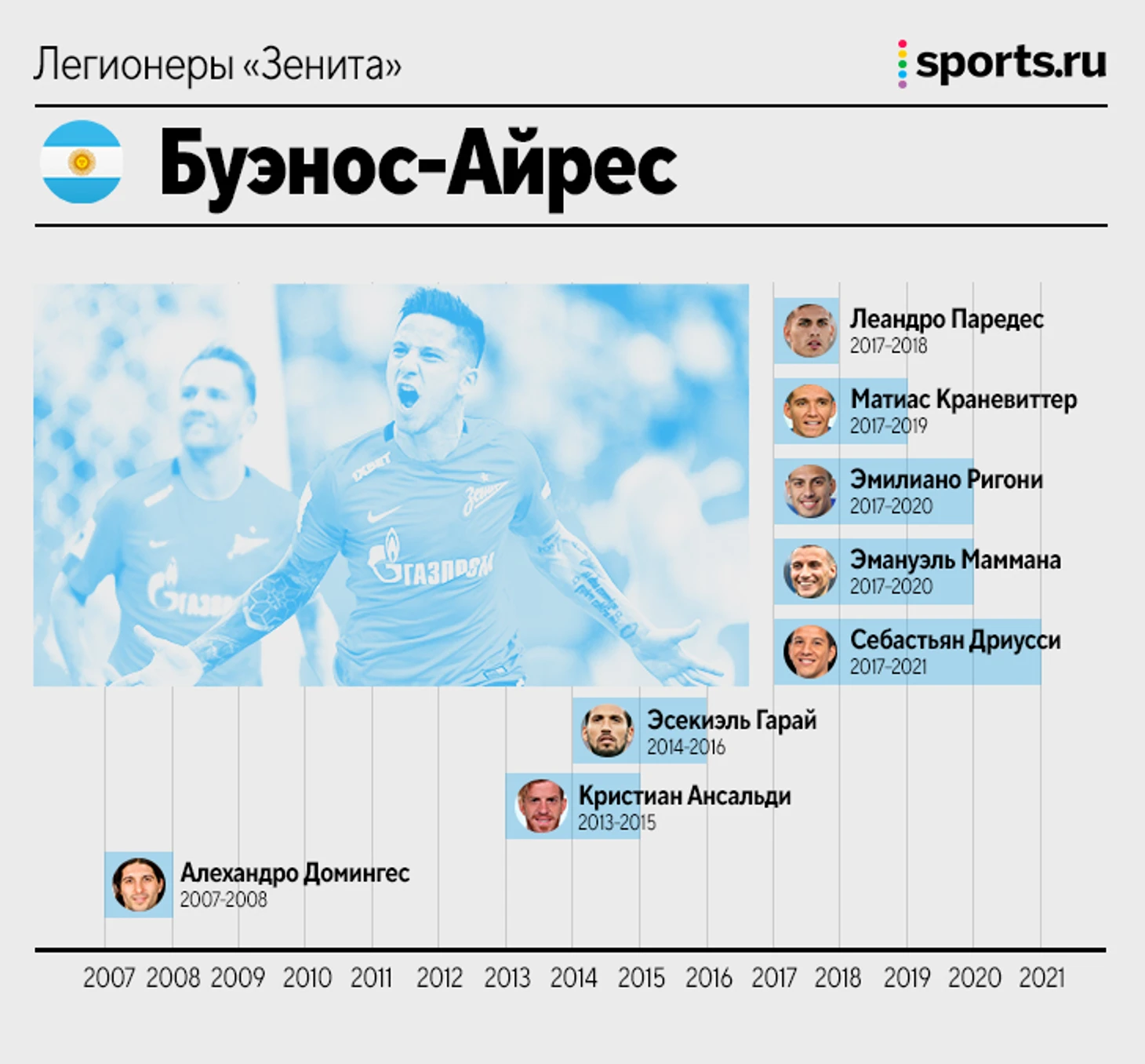 Летом 2017-го в «Зенит» пришел Роберто Манчини – и организовал самую масштабную закупку аргентинцев в истории клуба. В Петербург перебрались Леандро Паредес (23 млн евро), Себастьян Дриусси (15 млн), Эмануэль Маммана (16 млн), Эмилиано Ригони (9 млн) и Матиас Краневиттер (8,5 млн) – на аргентинских новичков потратили внушительные 71,5 млн евро.