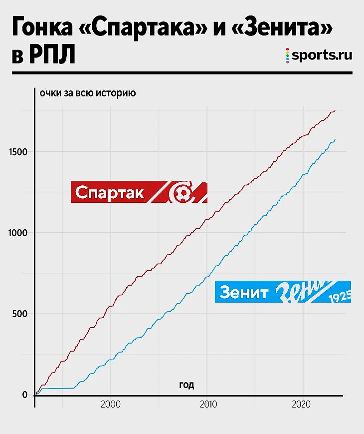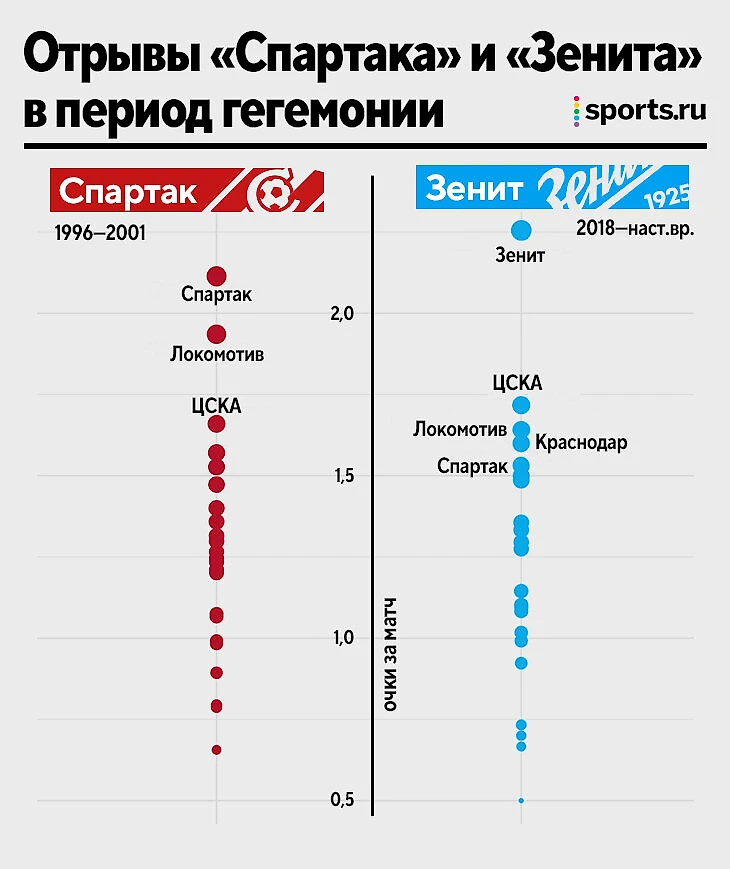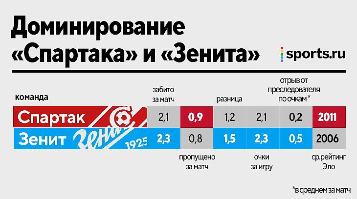 «Зенит» в эти пять лет берет в среднем по 2,3 очка за игру, тогда как «Спартак» в свое лучшее время – по 2,1. А уровень доминирования петербуржцев по очкам гораздо выше – посмотрите на отрывы доминаторов от преследователей. Но!