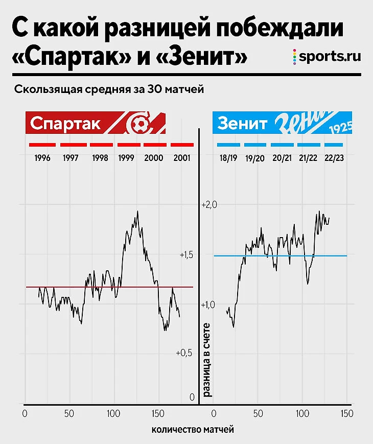 По картинке заметно, что уровень конкуренции в чемпионате в конце 90-х был немного другим. В эпоху доминирования «Зенита» никто из конкурентов не перевалил выше отметки 1,75 очка за игру, а у «Спартака» был преследователь посерьезнее – «Локомотив».