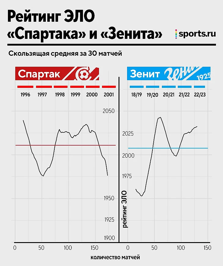«Спартак» посыпался на закате своей эпохи, но если брать шесть лет, то средний рейтинг Эло у доминатора конца 90-х выше, чем у современного «Зенита». Хотя моментами петербуржцы взлетали выше.