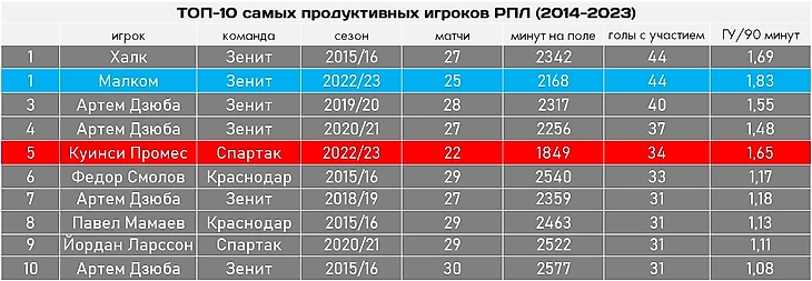 К слову, свой лучший сезон в России проводит и Куинси Промес, предыдущий максимум которого пришелся еще на эпоху Халка (30 в чемпионате 2015/16). Шансов достать кого-то из зенитовских бразильцев практически никаких, а вот вытеснить Дзюбу из тройки - непросто, но вполне выполнимо.