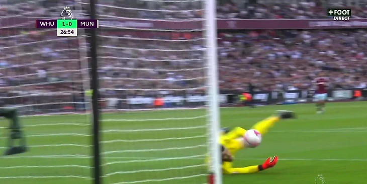 Ничто не мешало Де Хеа парировать удар, но он лишь слегка прикоснулся к мячу, а тот проскочил вдоль штанги в угол ворот.