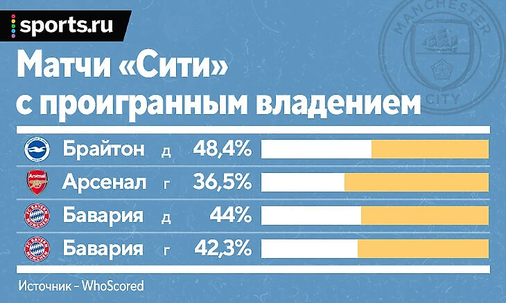 Мотивацию в виде ЛЧ можно расширить до топовых матчей в целом. В этом сезоне «Сити» не всегда удается навязать свою игру против больших команд или команд, которые играют как гранды. Набралось уже четыре матча, в которых «Сити» владел мячом меньше соперника. Не удивляйтесь попаданию в шорт-лист «Брайтона» – при Роберто де Дзерби в каждом матче играют первым номером, а по владению вообще идут в десятке лучших в Европе.