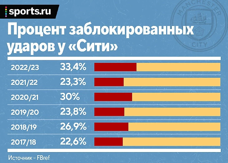 Надежность «Сити» с тройкой-четверкой ЦЗ неплохо передает процент заблокированных ударов. В этом сезоне – самый высокий для Гвардиолы в Манчестере. Сразу на 10% выше, чем в первой чемпионской кампании. Блокируется каждый третий удар: