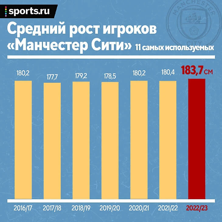 Нынешняя версия «Сити» берет не только позиционным футболом, но и мощью. Пеп построил самую габаритную команду в Манчестере. Для наглядности – средний рост 11 самых используемых игроков. Показатель этого сезона категорически выделяется на общем фоне. По сравнению с первым чемпионством команда подросла на шесть сантиметров.