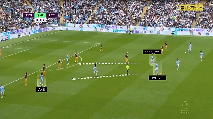 Помимо опции с отказом от прессинга, характеристики защитников позволяют Пепу маневрировать между матчами. Хороший пример тут – позиции Стоунза и Аканджи. В традиционном варианте Джон располагается на правом фланге, а Мануэль – в центре: