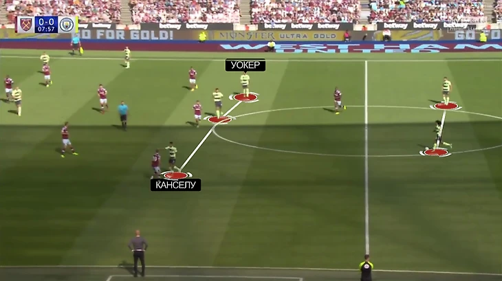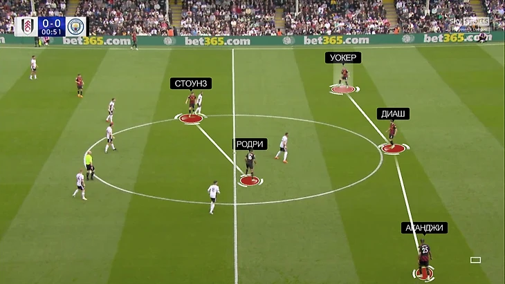Привычная структура «Сити», в которой Уокер был хорош, включала только двух центральных защитников и сразу двух ложных фулбеков. Вот как выглядело на старте сезона. Сзади пара Диаш – Аке, чуть выше находящиеся на одной линии с Родри (и исполняющие ложных фулбеков) Уокер и Канселу: