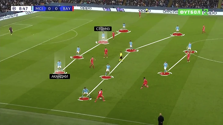 Против «Баварии» Пеп поменял их: теперь Аканджи – справа, а Стоунз – по центру. После матча Гвардиола объяснил, что хотел использовать скорость Ману против шустрых вингеров. Ход оправдался – Аканджи выиграл 7 из 10 индивидуальных дуэлей: