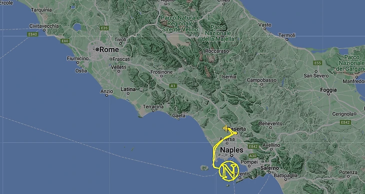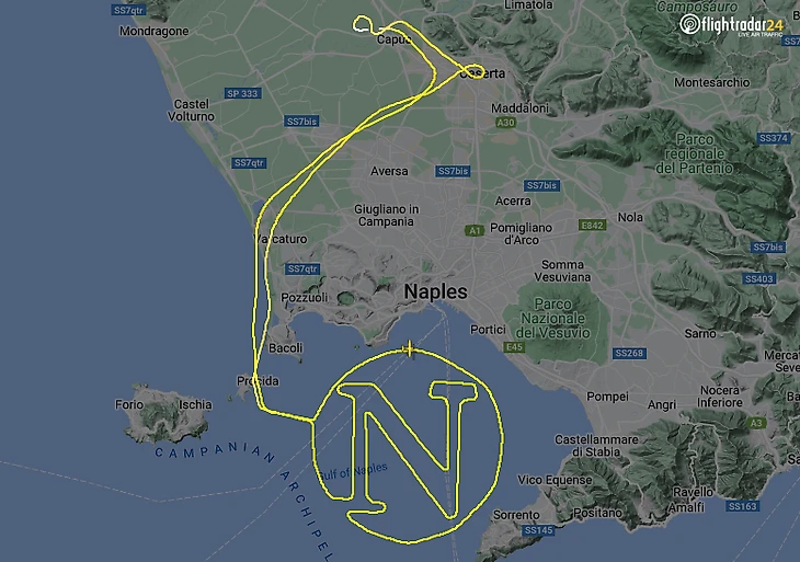 Сайт отслеживания полетов Flightradar24 показал 9 мая, что сделал один из фанатов клуба. Он на самолете Tecnam P-2008JC взлетел из города Капуа (28 км от Неаполя) и взял курс на Неаполитанский залив, а потом покружил так, что траектория нарисовала клубный логотип. Всего это заняло полтора часа. Если быть точным – 98 минут.