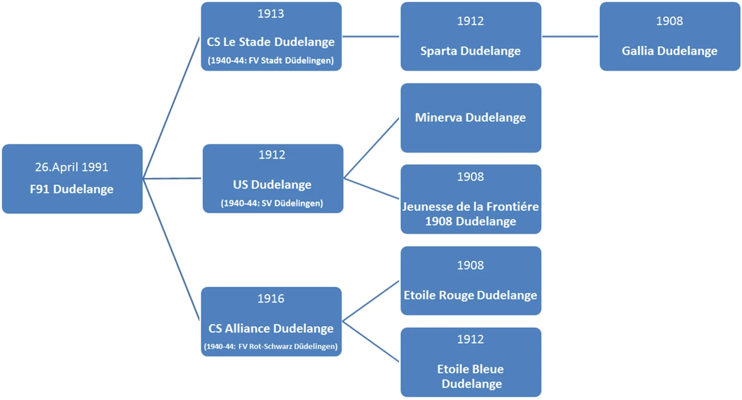Но если перечисленные выше клубы образовались при объединении двух команд, то самый известный клуб из Люксембурга имеет куда более запутанную историю. К появлению команды Ф-91 привело объединение пяти клубов, пусть оно и произошло не одномоментно. Вот как это выглядело.