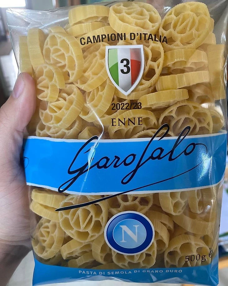 Но вот, когда Наполи стал официальным чемпионом, компания Pasta Gofaralo изготавляющая макароны тоже решила сделать подарок Неаполитанцам. Они выпустили макароны , с эмблемой клуба и впустили в продажу. Теперь каждый желающий в Неполе может купить этот продукт