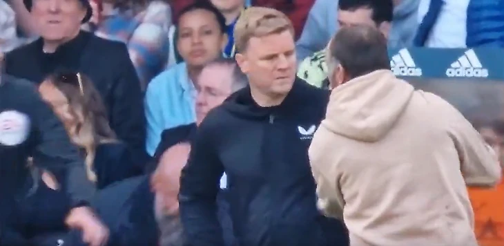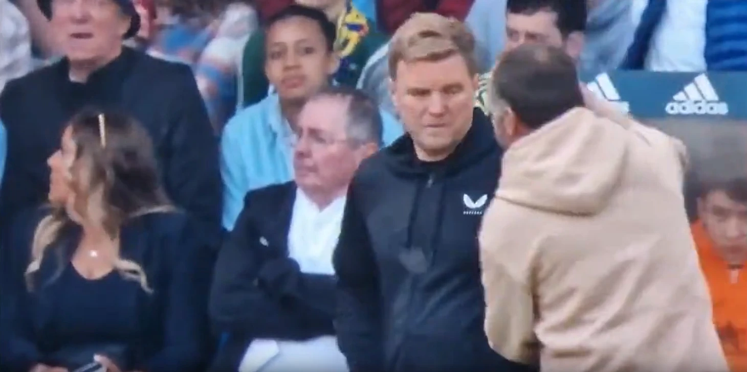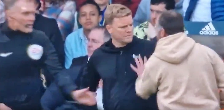 Когда игра подходила к концу, в техническую зону спокойно вышел болельщик, подошел к тренеру «Ньюкасла», схватил за руку, что-то сказал ему, а потом пихнул в плечо.