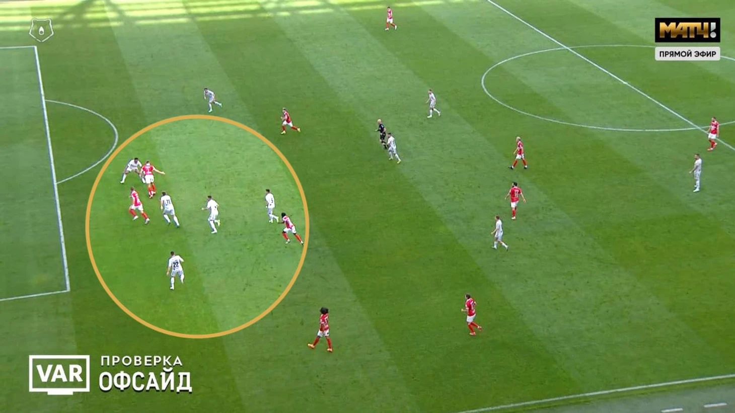 При игре 10 на 10 на поле появилось больше пространства, которое команды могли использовать при переходах мяча. Так произошло, например, в эпизоде с падением в штрафной ЦСКА Хлусевича. Пенальти не было (спартаковец приукрасил падение), и армейцы организовали контратаку три в два. Но уставший Заболотный запутался в решениях.