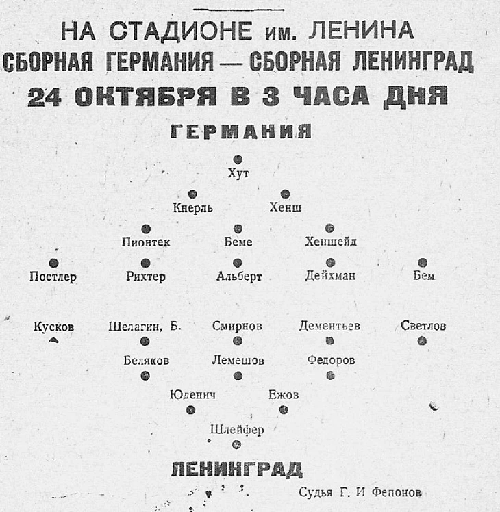 «Ко всеобщему удовольствию, после долгих волнений и отмен, сборная команда Германия 24 октября выступила против сборной Ленинграда. Трибуны и все пространство вокруг поля заполнены публикой до отказа. <…> Германцы выставили все свои лучшие силы, у ленинградцев не хватает двух основных нападающих - Бутусова и Елисеева.