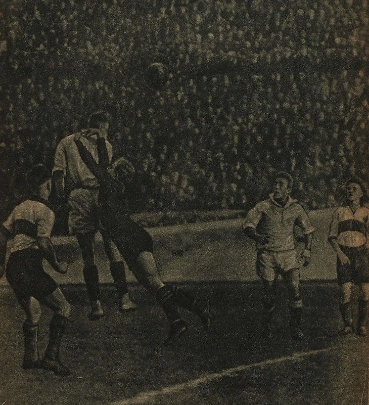30 сентября 1932 года. Москва. Стадион «Динамо». СССР - Германия - 3:2. Советская команда играла в голубых футболках и белых трусах. В игре Пауль Хут (журнал «Физкультура и спорт» № 21 за 1932 год)