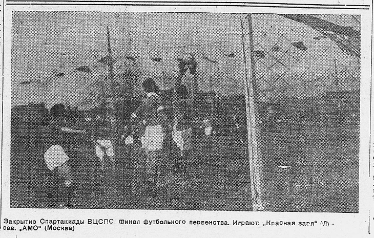 1 сентября 1932 года. Ленинград. Стадион имени В.И. Ленина. Первая Всесоюзная спартакиада ВЦСПС. Финал футбольных соревнований. «Красная Заря» (Ленинград) - АМО (Москва) - 0:1 (газета «Спартак» орган Ленинградского областного совета физкультуры № 7 от 10 сентября 1932 года)