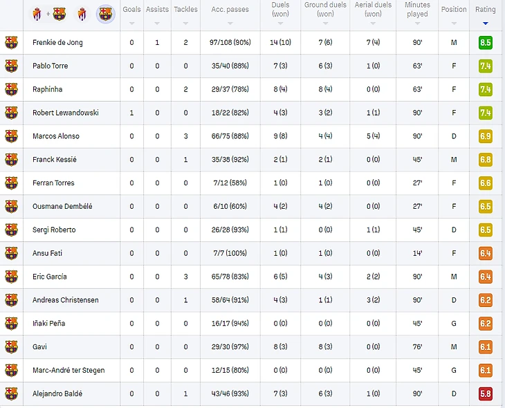 Лучший игрок матча − Френки де Йонг. Работал по всему полю, отдал голевую передачу на гол Левандовски, совершил 122 касания мяча и отдал 97 передач с точностью 89,8%. Кроме этого создал два голевых момента и отдал три ключевых передачи.