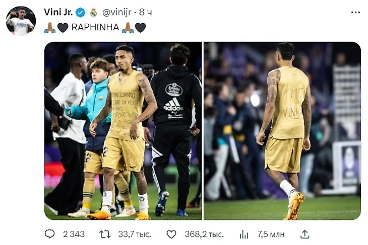 Как только матч закончился, Винисиус отреагировал на поступок вингера «Барсы», выложив его фотографии в свои соцсети: