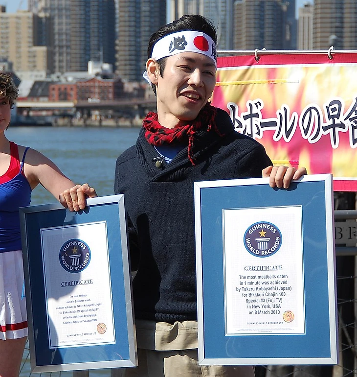 Такеру Кобаяши - обладатель восьми мировых рекордов Гиннеса по употреблению хот-догов, фрикаделек, тако, гамбургеров, мороженого, пасты, пиццы, твинки. Свой желудок спортсмен застраховал на 100 000 американских долларов.