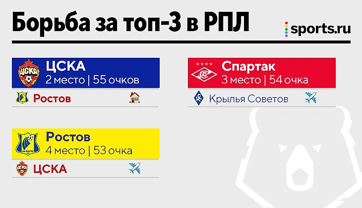 «Спартаку» победа над «Крыльями» точно принесет бронзу, а при потере очков ЦСКА – и серебро. При ничьей можно будет надеяться на поражение армейцев: тогда будет третье место, потому что красно-белые обойдут команду Владимира Федотова за счет личных встреч (2:2 и 2:1), но пропустят «Ростов» к серебру.