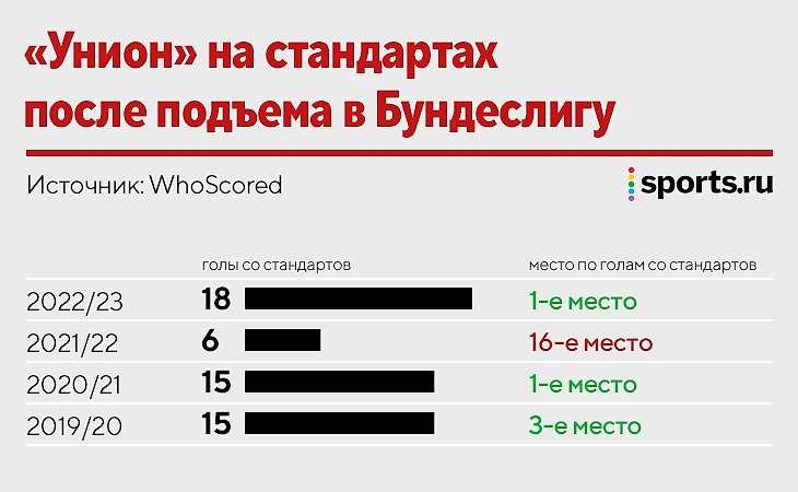 3. Везение. Очень много везения. Это банально, но нужно проговаривать. Вот косвенное подтверждение: без учета автоголов соперника «Унион» забил 49 голов, 19 из них оценены FBref ниже 0,10 xG. Доля таких неочевидных голов – 39%, больше в Бундеслиге только у «Шальке» (40,6%, 13 из 32). И у «Униона» в 8 случаях из 19 гол прилетал после стандарта, еще дважды – после фланговых передач с игры. Одной топ-реализации недостаточно, чтобы так часто забивать в неочевидных ситуациях. Фарт невозможно исключить.