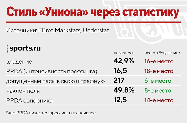 PPDA показывает, что прессинг «Униона» – наименее интенсивный в Бундеслиге.