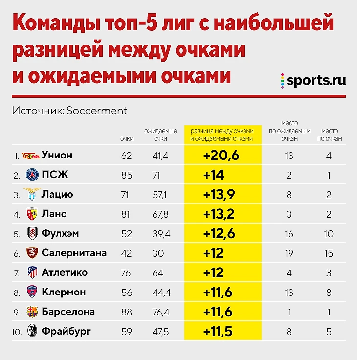 В этой истории есть и настоящая аномалия. Может, по ходу сезона вы слышали, что «Униону» постоянно везет и что команда взломала xG. Финишировав 4-м в Бундеслиге по очкам, «Унион» закончил 13-м по ожидаемым очкам, которые считаются на основе разницы xG в каждом отдельном туре (данные Soccerment на основе статистики Opta).