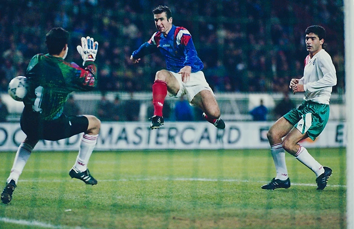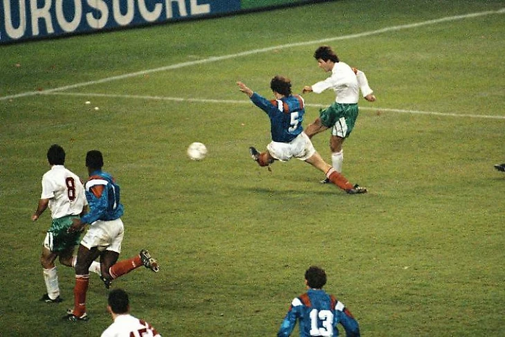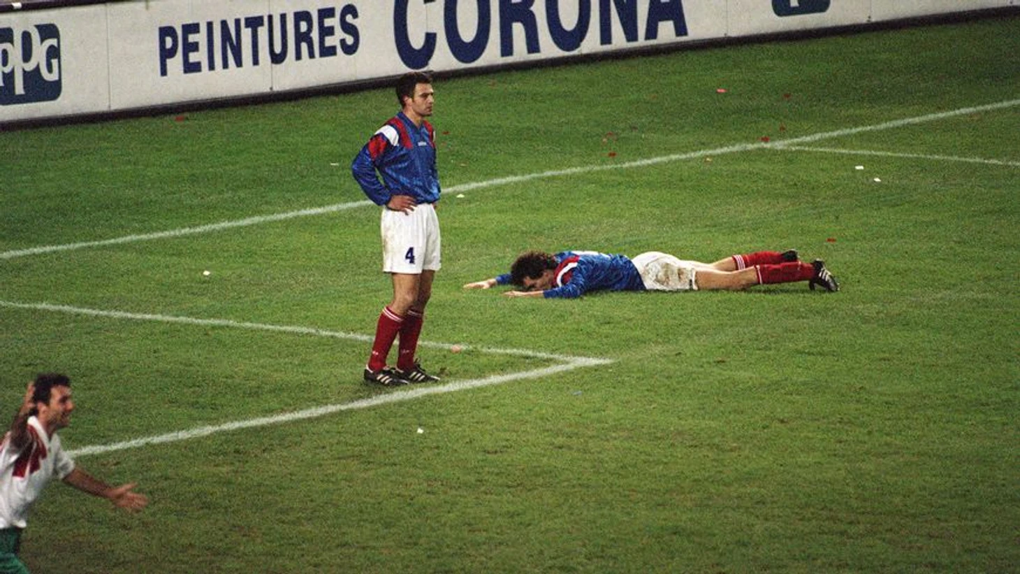 Лоран Блан (№5) не успевает блокировать удар Костадинова...Спустя секунду вся Франция погрузится в глубокий траур