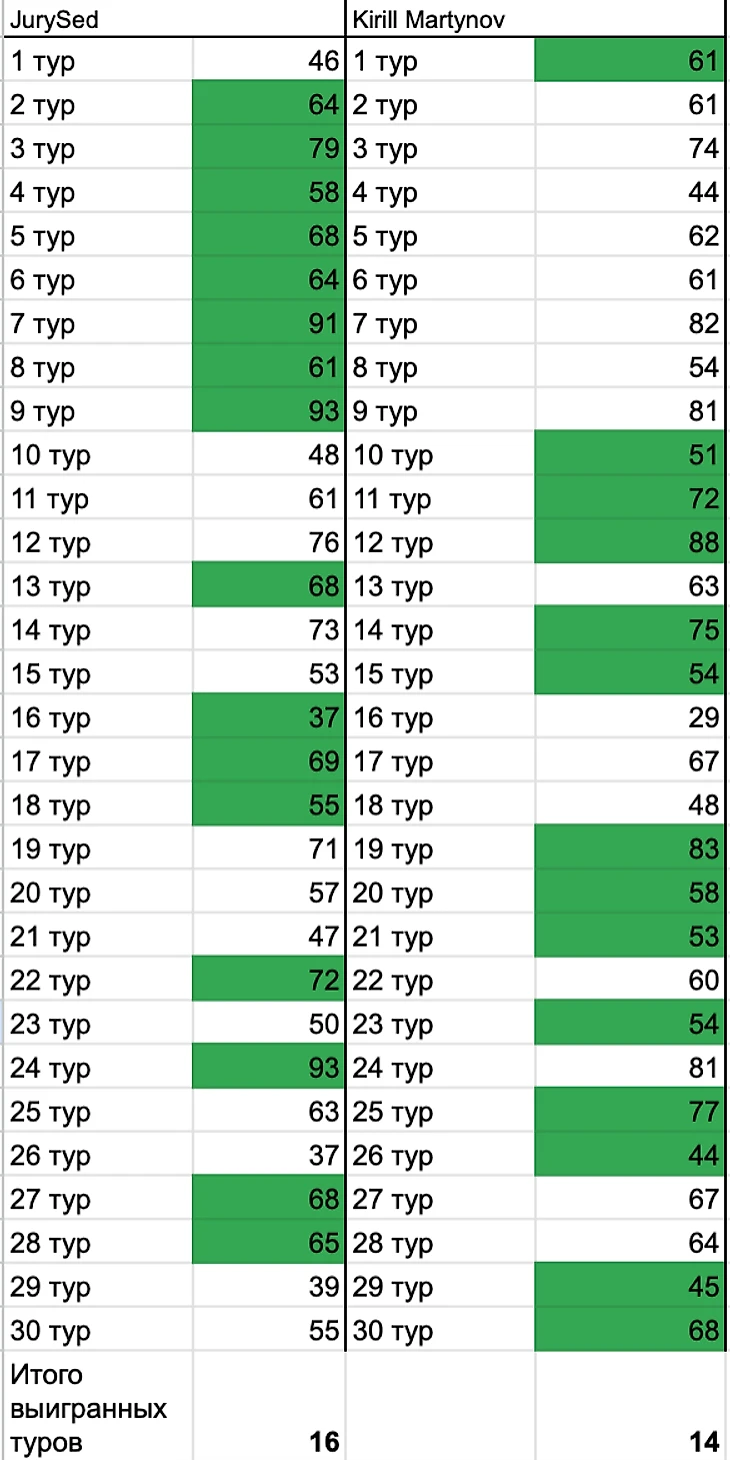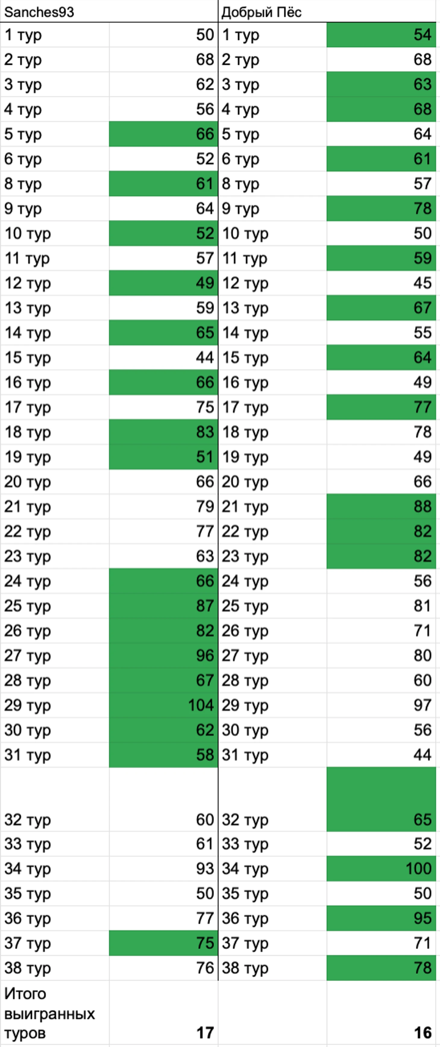 К сожалению, физические призы для фэнтези-турниров у нас только в одном экземпляре. Поэтому определить его получателя было необходимо. Для выявления победителя при равенстве очков было решено воспользоваться системой head-to-head и сравнить, кто из двух победителей побеждал в большем количестве туров между собой: