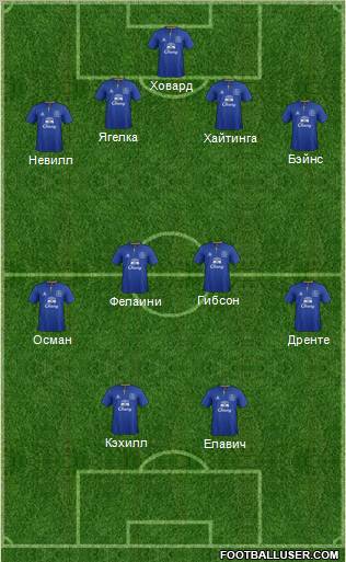 Эвертон (4-4-2): Ховард,Ягелка, Хайтинга, Бэйнс, Невилл, Гибсон, Фелаини, Осман, Дренте, Кэхилл, Елавич.