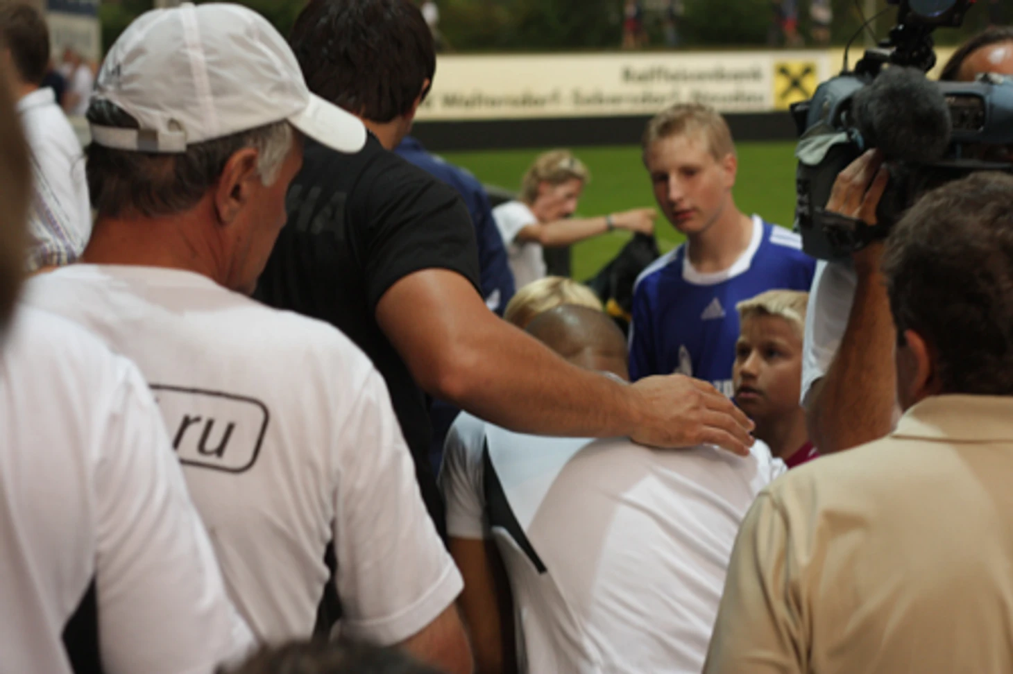 Вскоре после начала матча на Бад-Вальтерсдорф обрушивается чудовищный ливень, и холмы закономерно пустеют. Концентрация людей вокруг буфета резко возрастает, и ветер все активнее доносит до тренерской скамейки запах жареных сосисок. И уже нетрудно поверить в местные легенды о том, как в прошлом году во время матча «Арсенала» на этом стадионе уместились три с половиной тысячи человек.